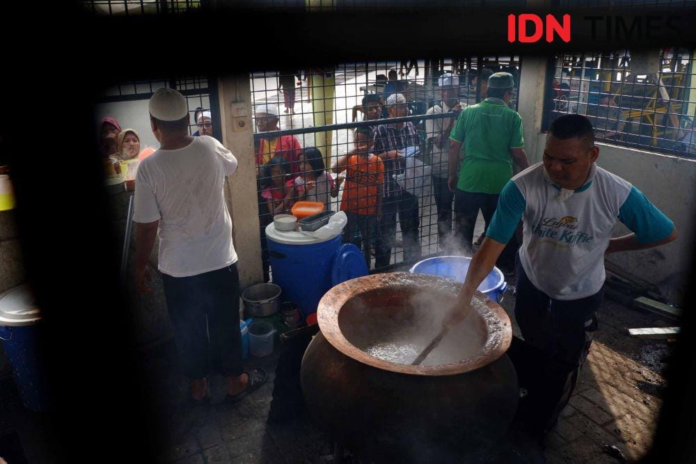 Tangan-tangan lainnya pun menggapai wadah yang sudah berisi bubur. Pemandangan rebutan bubur sop ini sudah biasa kala Ramadan. Karena sudah menjadi tradisi puluhan tahun.