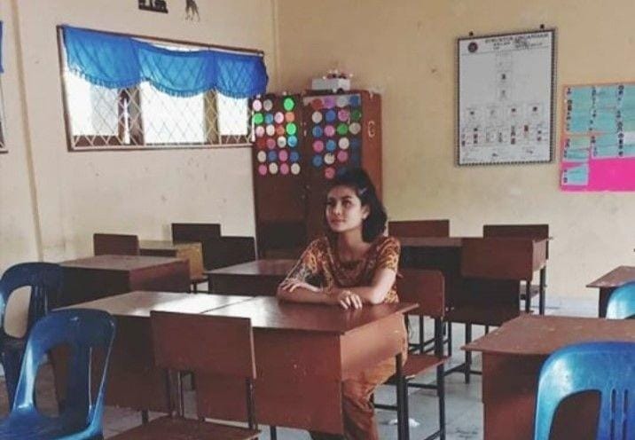 1. Awkarin duduk di bangku kelas sekolah yang dulu mungkin pernah didudukinya