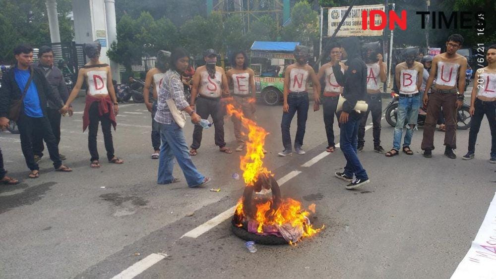 Pantauan IDN Times di lokasi aksi, sebelum bergerak menuju titik aksi, massa berkumpul membentuk barisan di depan pintu kampus Fisip USU. Mereka membentangkan spanduk yang berisi kecaman terhadap kampus dan massa aksi juga melakukan aksi body painting yang bertuliskan kata 'Dosen Cabul'.