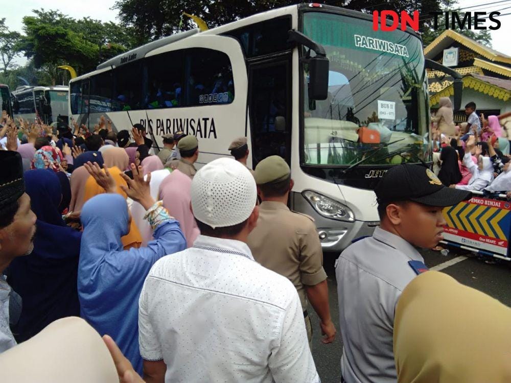 Sontak saja isak tangis bahagia disertai lambaian tangan dan seruan selamat jalan dari para anggota keluarga dan kerabat mengiringi keberangkatan para jemaah calon haji Kota Binjai menuju Asrama Haji Kota Medan.