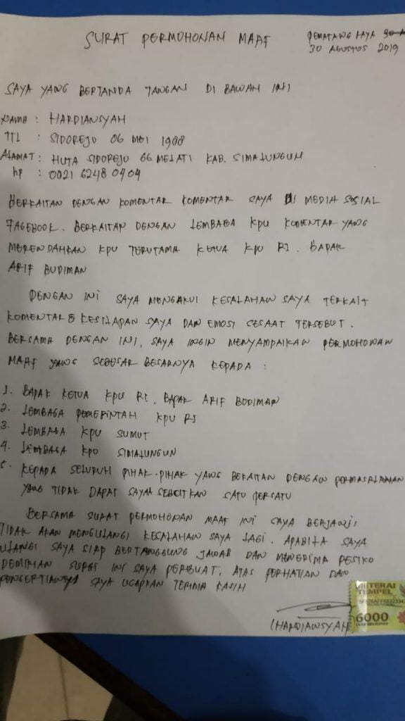 “Saya terbawa emosi didalam kolom kementar. Saya berjanji tidak akan mengulangi kesalahan itu dan apabila terulang saya siap bertanggungjawab dan menerima resiko,” kata Hardiansyah dalam permintaan maafnya yang ditujukan kepada Arief Budiman, kepada lembaga KPU RI, KPU Provinsi Sumut dan KPU Simalungun.