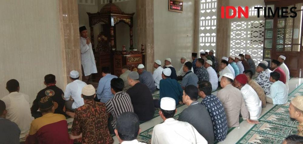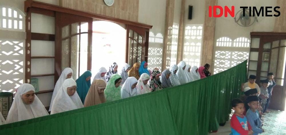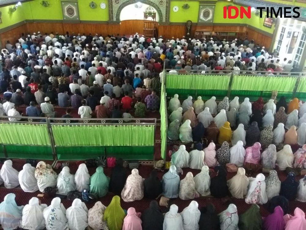 Puluhan jemaah baik laki-laki dan perempuan begitu khusyuk melaksanakan salat.